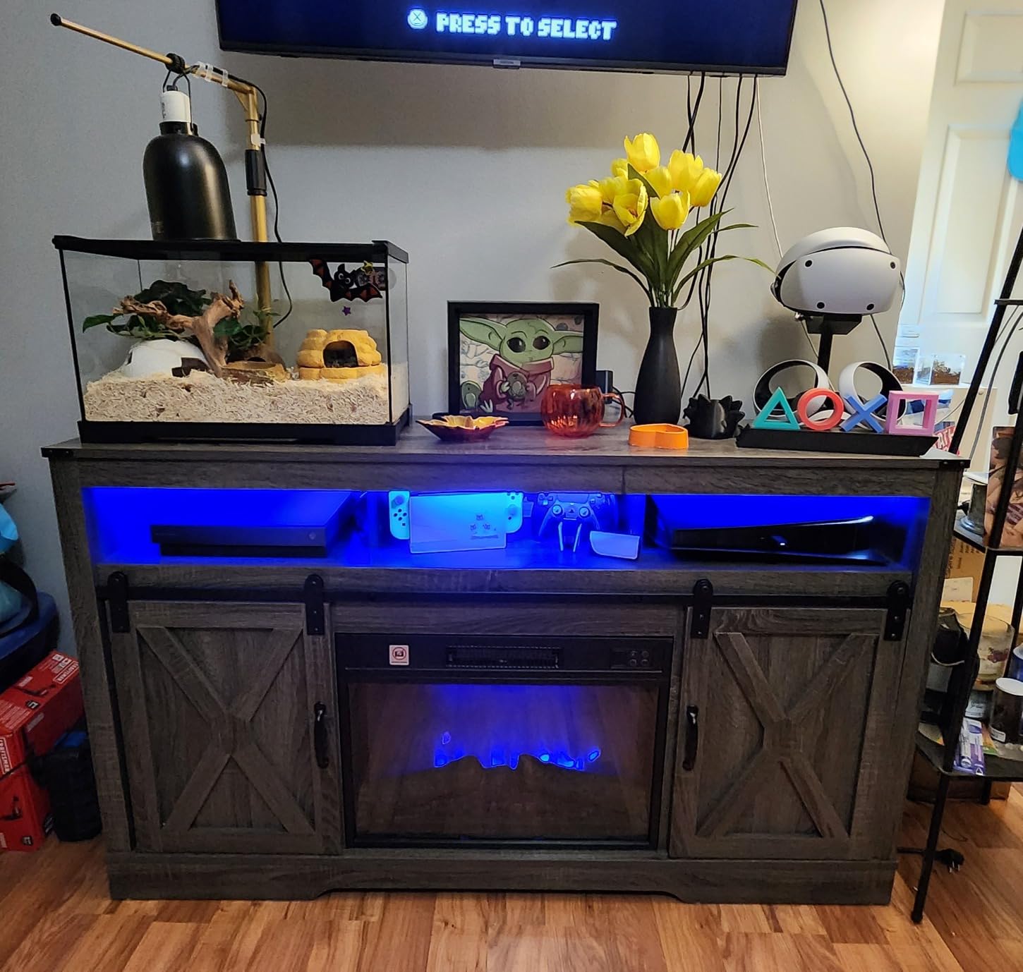 I added LED lights to the top section of the stand where I have all my game consoles and cut extra cord holes in the back panel since it only comes with the one big one in the center. It doesn't come with LEDs! I've seen some similar TV stands that do, which is what inspired me to get some. I love it, im really happy with it over all. It's been a long journey, but I'm glad it's finally over and I can enjoy it!
