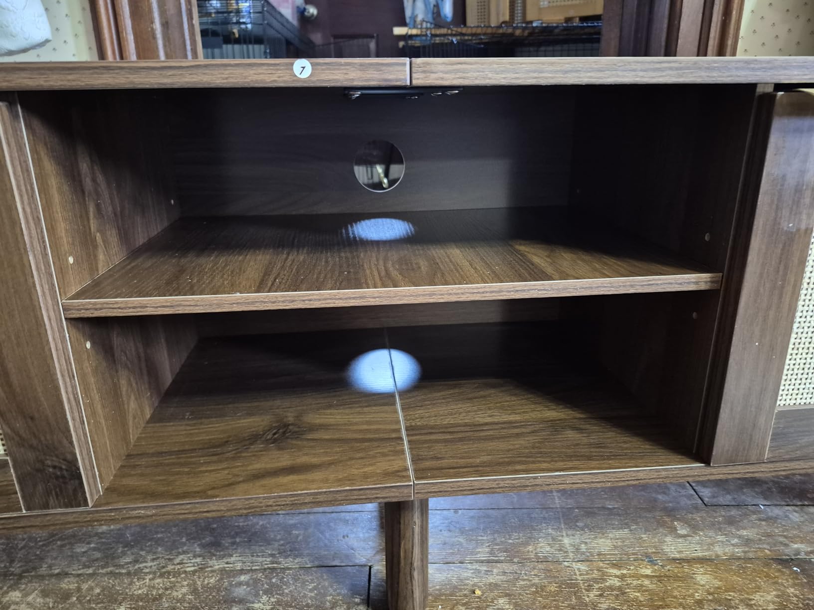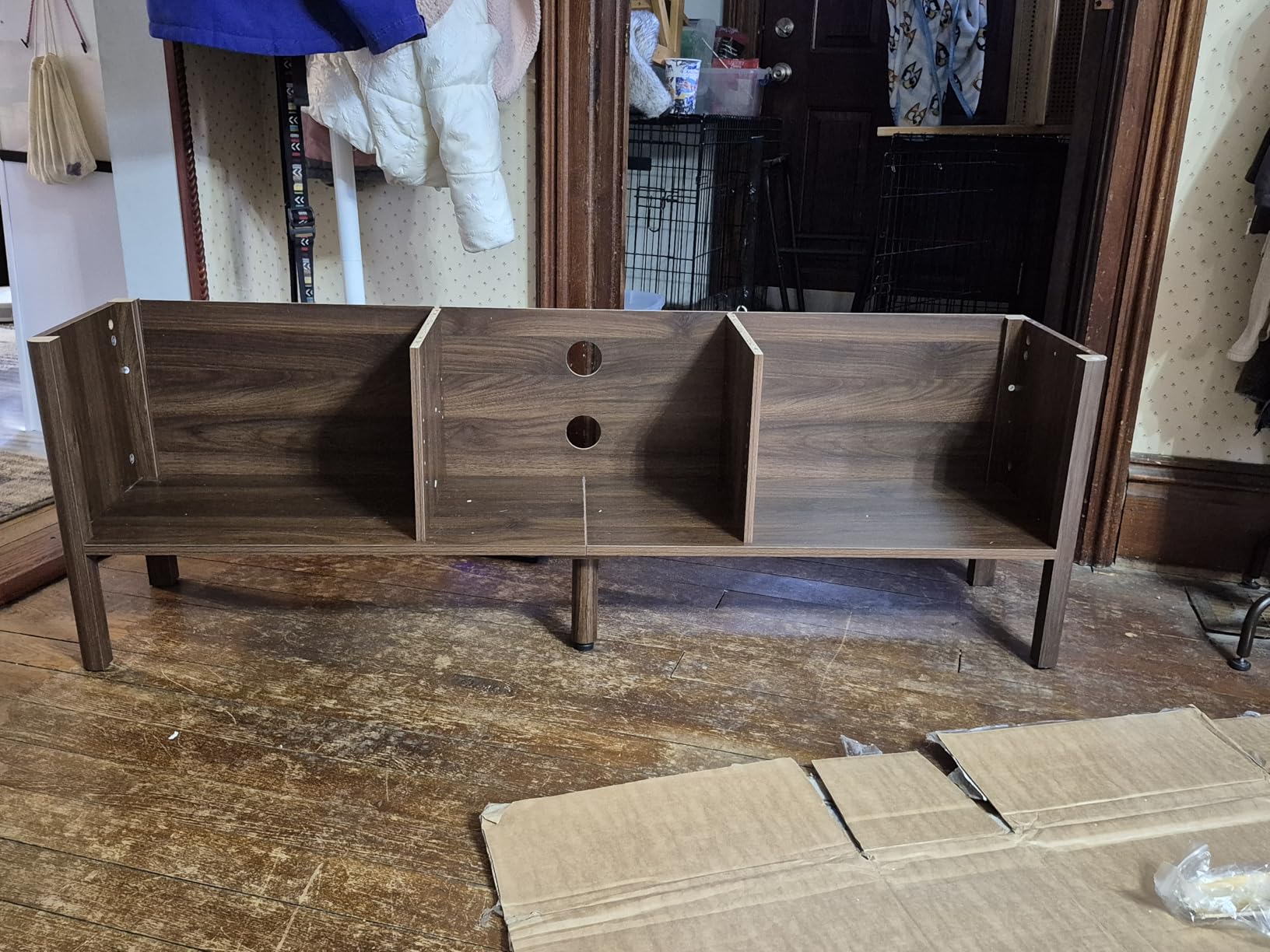 The storage space is very practical too. The two cabinets are great for keeping things out of sight, and the adjustable shelf in the middle makes it easy to organize media devices, gaming consoles, or other living room items. I decided to keep one if the doors off to display my wedding photo and I think it looks beautiful like that so I love the versatility. I also appreciate the cable management holes in the back, which help keep cords from looking messy behind the TV.